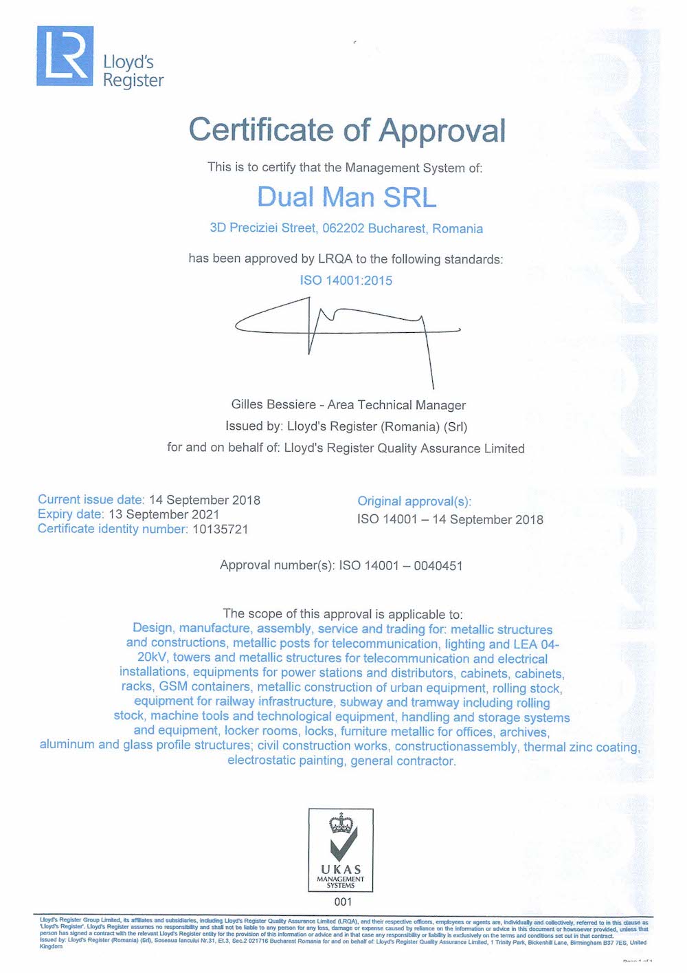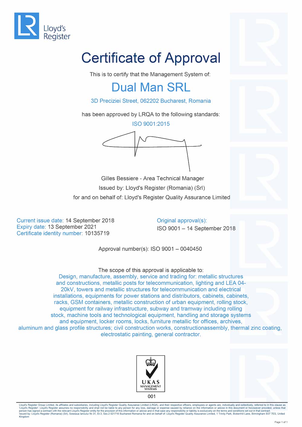 dual man has put in place an integrated Quality, Environment and Labor safety and Security Management System certified by the following: